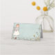 This place card design feature a watercolor image of Anne on a robin's egg blue background with a delicate leafy vine on both edges. Colours include rose red, sage green, pale blue, orange, pink and white. The reverse side has the same background colour and leafy vine details.