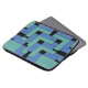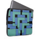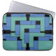 Annexe laptop sleeve. Annexe is an abstract design created by Anna M. Asbury and consists of turquoise and blue blocks on a black background.