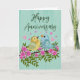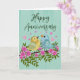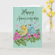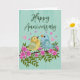 This is a lovely anniversary card for a couple that is celebrating their love. It has two birds together on a flowering tree branch with hearts. The background has light blue and green stripes.
