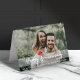 The card shows an example image a fun young romantic couple, a women with dark brown hair, drop earrings and a silver gray dress and a man with brown hair and a beard in a white short. He is giving her a piggyback, she is hugging him from behind. She has a beautiful coral orange pink rose in her hand. There are trees in the backdrop, it could be the scene of thier wedding.This images is designed as a placeholder to be replaced by your favorite photo or family picture.