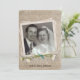 Old-fashioned photo frame and daisy bouquet with couple's photo for anniversary dinner party.