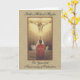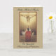 This is a beautiful Priesthood Anniversary card with a souvenir vintage holy card with a priest offering the Mass at the Consecration on the altar in front of Jesus on the Crucifix. A light golden lace background is behind the image. The background is gold damask design. All fonts and texts may be modified.