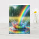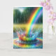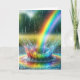 Vibrant rainbow arcs down to splash into a pool of water, creating a colorful burst as raindrops fall around.