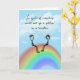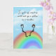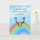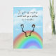 Cute stick figure couple with hair sitting on a rainbow with romantic text.