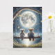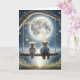 Boy and girl teddy bears sit on a wooden swing, gazing at a large, luminous moon over a serene body of water.