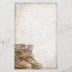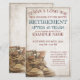 Announcement of retirement with old worn and weathered lace-up boots in vintage style. Gender-related text, the year, the honorary text, the date, the time, the place of celebration and RSVP can be customised.