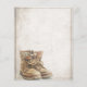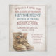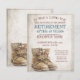 Announcement of retirement with old worn and weathered lace-up boots in vintage style. Gender-related text, the year, the honorary text, the date, the time, the place of celebration and RSVP can be customised.