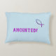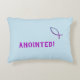 Light blue accent pillow with "Anointed!" and illustrated fish image. The purple color symbolizes royalty, therefore anointed. The fish or ichthys is the secret symbol used by early Christians to identify each other and gather without persecution.