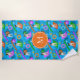 This colourful dog pool party beach towel for Parson / Jack Russell Terrier lovers features a pattern of four different JRTs / PRTs with varied brown and black head/body markings and a charming doggy head tilt standing on their colourful blue, pink, orange and lime pool float mats with a tennis ball in a clear blue swimming pool, surrounded by colourful swimming noodles and balls and yellow starfish-shaped floating chew toys - her monogram is customisable on a bright orange circle pendant - Parson / Jack Russell pool party © katz_d_zynes 2021