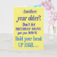 Customize this funny birthday card about getting older, or send it as it is. Either way, it's sure to get a laugh. The outside of the card has shades of blue letters on a sunny yellow background and says, "Another year older? Don't let BIRTHDAY BLUES get you DOWN. Hold your head UP HIGH..." The inside punchline, softened by blue skies and clouds, says, "You'll have fewer chins" Then further down, "Keep your chin up, kid. Happy Birthday!" Funny card for older person or a younger person who kids about aging.