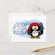Funny cartoon pirate penguin with parrot, standing in front of an igloo.