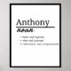 This personalised name definition poster is more than just a decoration; it's a thoughtful and meaningful addition that will be cherished for years to come. Celebrate the individuality of Anthony with this beautifully designed and personalised poster.