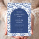 This invitation features a blue and white pattern in imitation of antique French toile de jouy, depicting countryside landscape vignettes of buildings and trees. The text appears in white on a navy blue arch shape. The back repeats the blue and white toile pattern.
