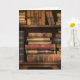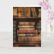 Antique books sit in a bookcase, probably in a charming library with old world charm. The sun streams in the window. A perfect card for the antique lover and reader.