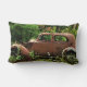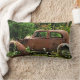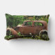 This lumbar pillow features a poor junker jalopy left to rust in the woods. It is surrounded by green trees and white wildflowers. There is a certain beauty and dignity to this rusty old orange, brown and blue car.