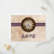 This Antique Clock Wedding Response Postcard features a vintage timepiece prominently centred on top of a metal ball chain and sleek purple striped border. The distressed look of the grungy paper texture background completes the antiqued feel of this unique RSVP postcard. This offbeat wedding response postcard is perfect for a vintage or steampunk inspired wedding. Easy to customise, simply add your wedding details in the text fields provided. Click on "Customise It" to find additional options to personalise this design.