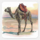 A vintage illustration from an 1899 children's book of a one-hump camel (Camelus dromedarius) with a red and yellow striped pack strapped to its back, walking across the desert sand.