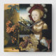 Hanged red yellow grapes with blue ribbon ,grape vines ,red green fall leaves.Beautiful blonde girl with gorgeous dress and gold jewellery with red hat and white feathers and lake landscape in background by German painter Lucas Cranach the Elder 1530 .Classic,elegant vintage style digital collage .with Flemish and Renaissance German paintings,