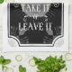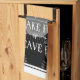 This kitchen towel has a antique kitchen sign design with the saying “On Today’s Menu – Take it or Leave It”. Behind that is a classic label shape in black, grey starburst, dishes, silverware, and glasses. A great hand towel to hang in a black and white kitchen.