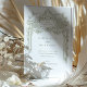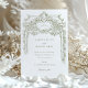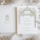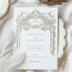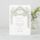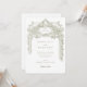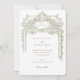 This elegant wedding invitation features an antique-inspired design with a soft ivory background and detailed olive-toned floral and architectural accents. The front of the card is beautifully adorned with an intricate floral arch, framing the wedding details in a classic serif font, evoking a sense of timeless elegance and refinement. The back of the card showcases a delicately sketched urn filled with flowers, adding a personal and sophisticated touch. The muted olive tones paired with the antique ivory create a harmonious and luxurious feel, making this invitation perfect for a formal, vintage-inspired wedding. This invitation is a perfect blend of classic design and understated luxury.