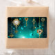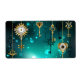 Gold, antique keys with gears and dials hang on gold chains on luminous green background.