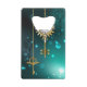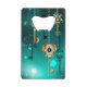 Gold, antique keys with gears and dials hang on gold chains on luminous green background.