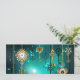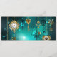 Gold, antique keys with gears and dials hang on gold chains on luminous green background.
