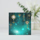 Gold, antique keys with gears and dials hang on gold chains on luminous green background.