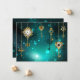 Gold, antique keys with gears and dials hang on gold chains on luminous green background.