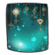 Gold, antique keys with gears and dials hang on gold chains on luminous green background.
