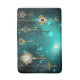 Gold, antique keys with gears and dials hang on gold chains on luminous green background.