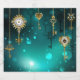 Gold, antique keys with gears and dials hang on gold chains on luminous green background.