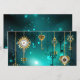 Gold, antique keys with gears and dials hang on gold chains on luminous green background.