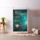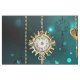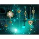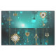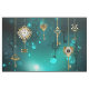 Gold, antique keys with gears and dials hang on gold chains on luminous green background.