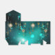 Gold, antique keys with gears and dials hang on gold chains on luminous green background.