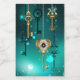 Gold, antique keys with gears and dials hang on gold chains on luminous green background.