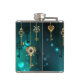 Gold, antique keys with gears and dials hang on gold chains on luminous green background.