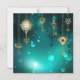 Gold, antique keys with gears and dials hang on gold chains on luminous green background.
