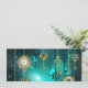 Gold, antique keys with gears and dials hang on gold chains on luminous green background.