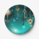 Gold, antique keys with gears and dials hang on gold chains on luminous green background.