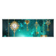 Gold, antique keys with gears and dials hang on gold chains on luminous green background.
