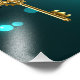 Gold, antique keys with gears and dials hang on gold chains on luminous green background.