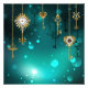 Gold, antique keys with gears and dials hang on gold chains on luminous green background.