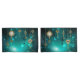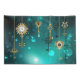 Gold, antique keys with gears and dials hang on gold chains on luminous green background.