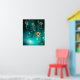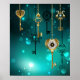 Gold, antique keys with gears and dials hang on gold chains on luminous green background.
