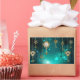 Gold, antique keys with gears and dials hang on gold chains on luminous green background.