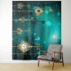 Gold, antique keys with gears and dials hang on gold chains on luminous green background.