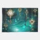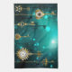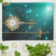 Gold, antique keys with gears and dials hang on gold chains on luminous green background.