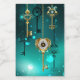 Gold, antique keys with gears and dials hang on gold chains on luminous green background.