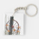 Antique wagon wheel hanging on a fence post with flowers. Image is on both sides of keychain. This also matches my wedding invitations and would make a great Thank You gift.